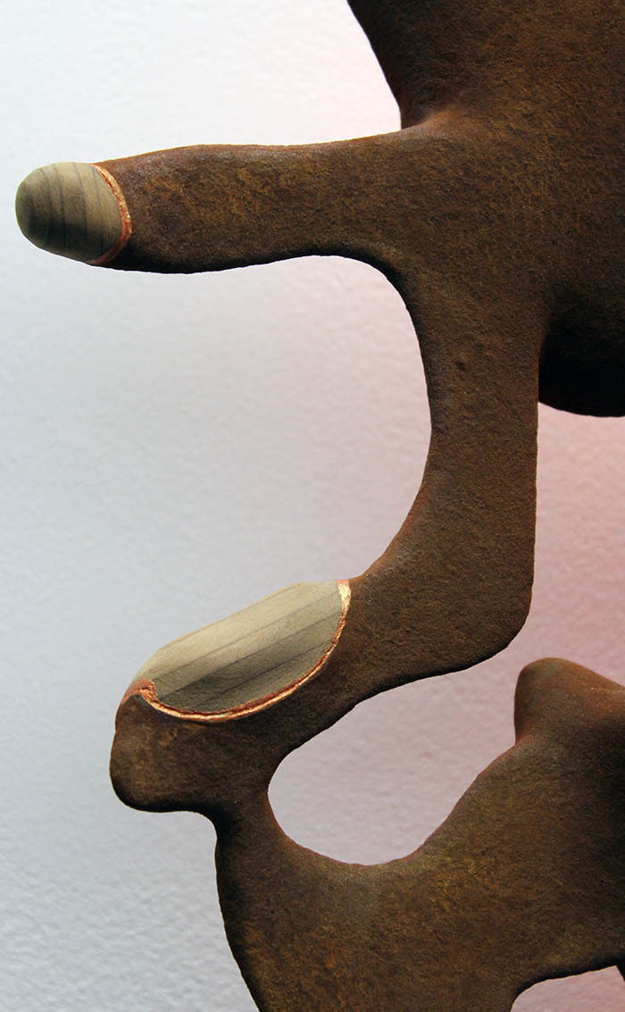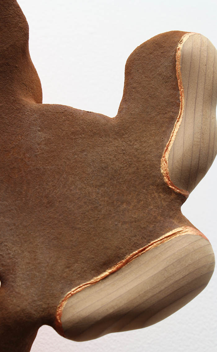 Oxidized iron paint on wood and resin-spackle, reclaimed redwood, acrylic paint, dye