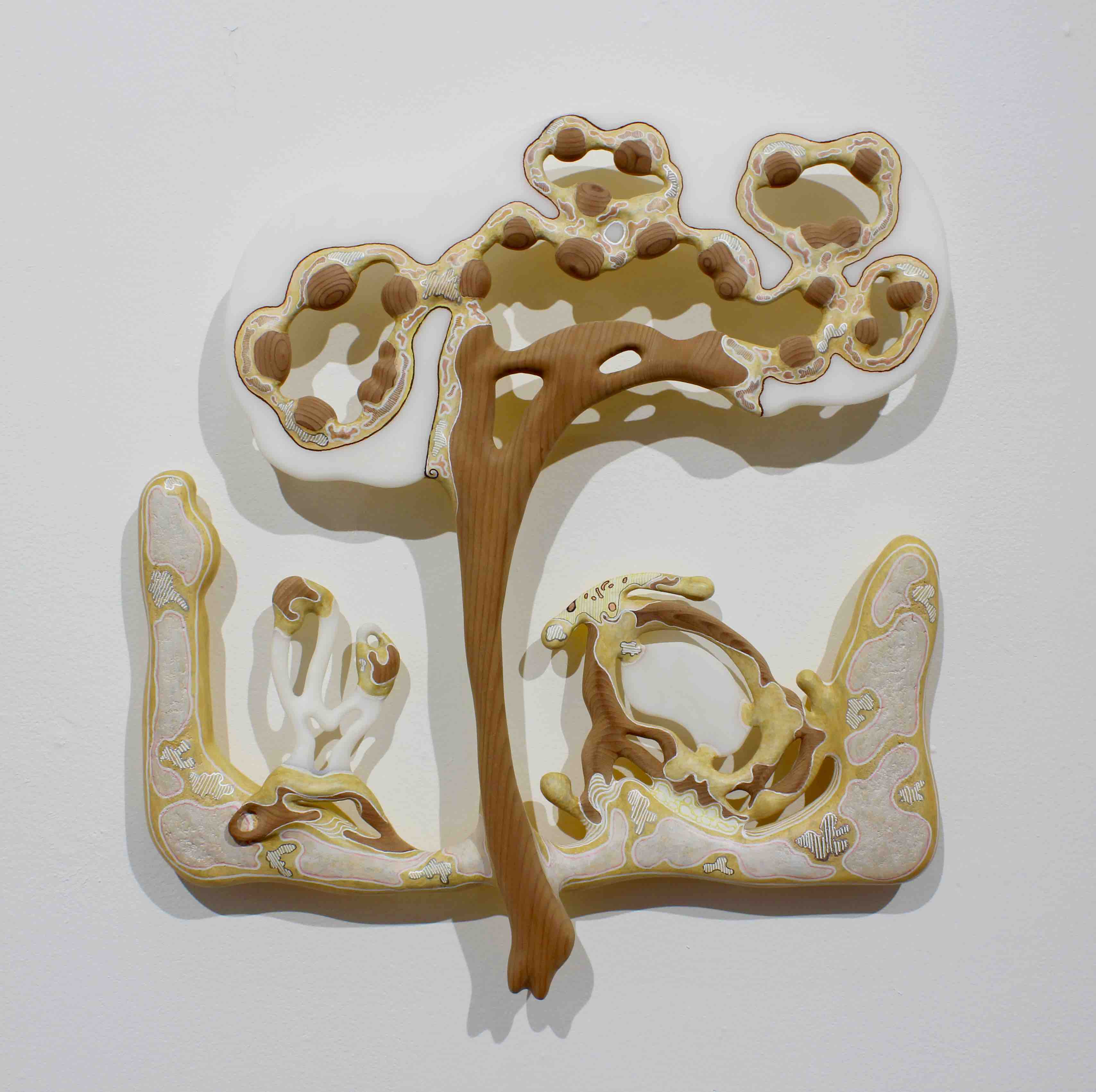 acrylic on wood, reclaimed redwood, sawdust, resin-spackle, high-density polyethylene, ink