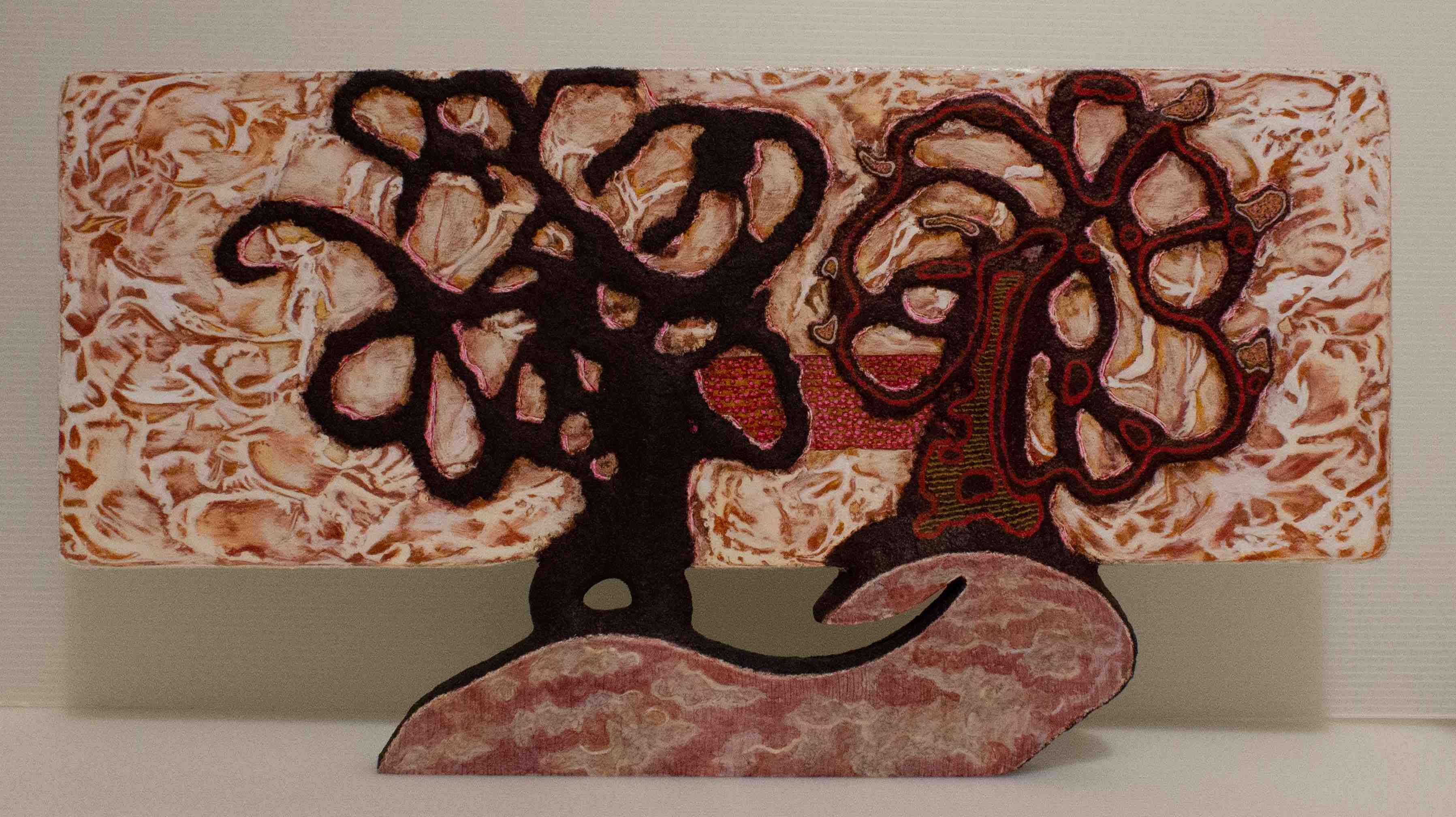 reclaimed redwood, sawdust, adhesive, resin-spackle, acrylic, ink