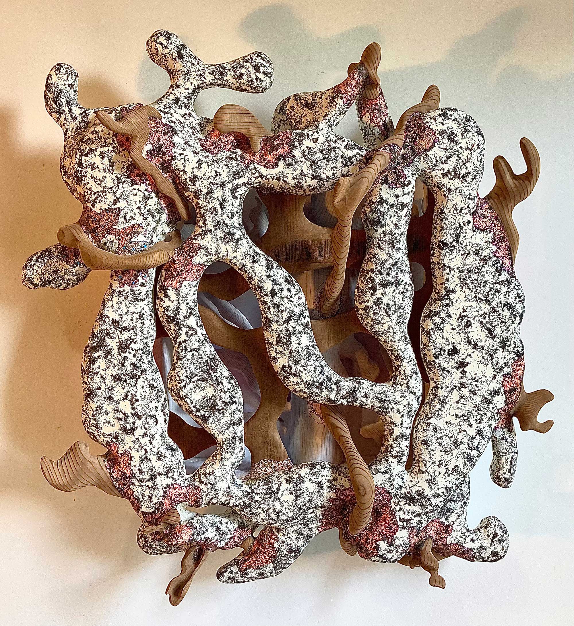 reclaimed redwood, mdo, sawdust, resin spackle, adhesives, acrylic, ink